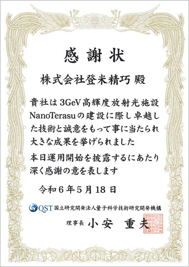 2024.05.18 ナノテラス運用開始にあたり 感謝状を頂戴しました