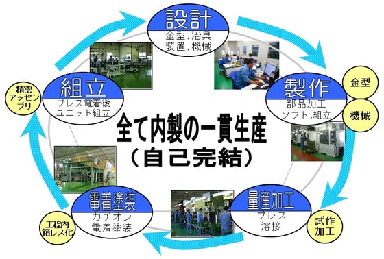 産業ロボット関連の設計製作と精密部品加工、プレス加工、ユニット組立等を自己完結で行っています。