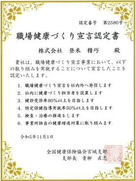 全国健康保険協会(協会けんぽ)宮城支部様の「職場健康づくり宣言制度」に登録しました。